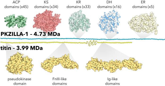 PKZILLA-1 ist 25 % größer als Titin, der bisherige Rekordhalter, der in menschlichen Muskeln vorkommt und eine Länge von 1 Mikrometer (0,0001 Zentimeter oder 0,00004 Zoll) erreichen kann.